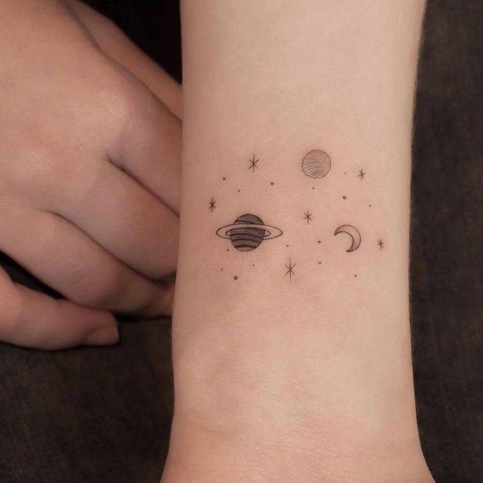 For enthusiasts of stars, the night sky, space, or stargazing, this tattoo might be an ideal choice. Adorning the arm, this tattoo encompasses stars, a moon, and a planet, presenting a trendy and distinctive idea that suits everyone. Whether you choose to recreate this specific design or opt for a similar tattoo with a different planet, adding some color could enhance the boldness of the overall design.