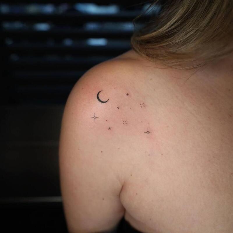 Presenting our next exquisite tattoo idea: a stunning back tattoo adorned with numerous small stars. Some stars showcase a blue hue, while others appear darker. The design is particularly enchanting as the stars begin from the neck, span across the back, and gracefully conclude on the shoulder. This tattoo promises an amazing appearance, and you have the freedom to recreate it in a color of your choice.