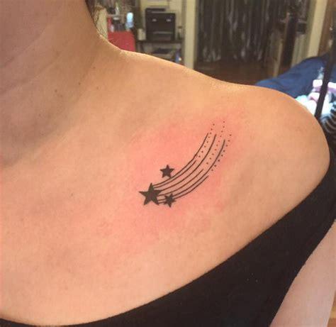 Moving on, we present a chic and distinctive star tattoo. This collarbone tattoo showcases a minimalist shooting star design composed of three intersecting black lines, with two lines forming the tail. The simplicity and stylishness of this design make it perfect for individuals who appreciate unique and small tattoos.