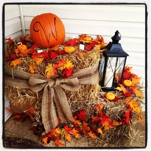 Craft a warm and inviting entryway for guests with a charming display of fall-themed items. Combine traditional favorites like pumpkins and bales of hay, layered with vibrant mums in rustic wooden baskets, to establish a cohesive color palette of orange and tan. To enhance visual interest, vary the sizes and shapes of the pumpkins for a dynamic and engaging arrangement.