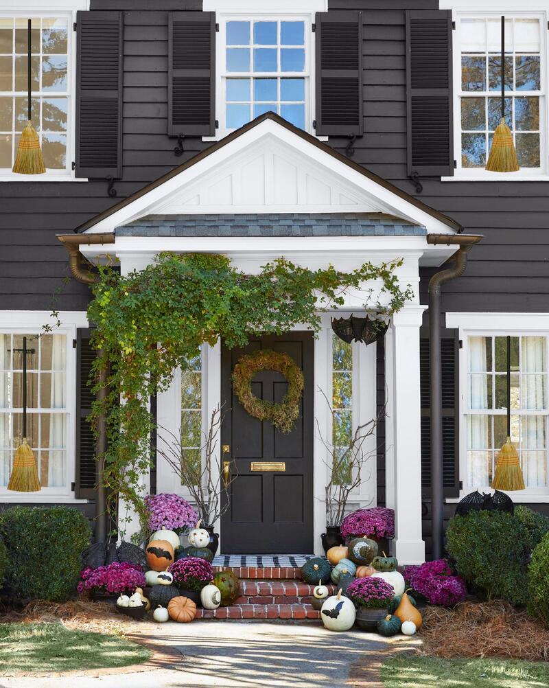 Straight from the pumpkin patch, heaps of pumpkins and gourds harmonize beautifully with potted croton and mums, creating a fall-tastic entryway full of charm. A personal touch is added with vinyl house numbers on a tall pumpkin, enhancing the display’s uniqueness. The cheerful hues of this front porch, showcased in HGTV Magazine, are guaranteed to brighten even the dreariest of days.