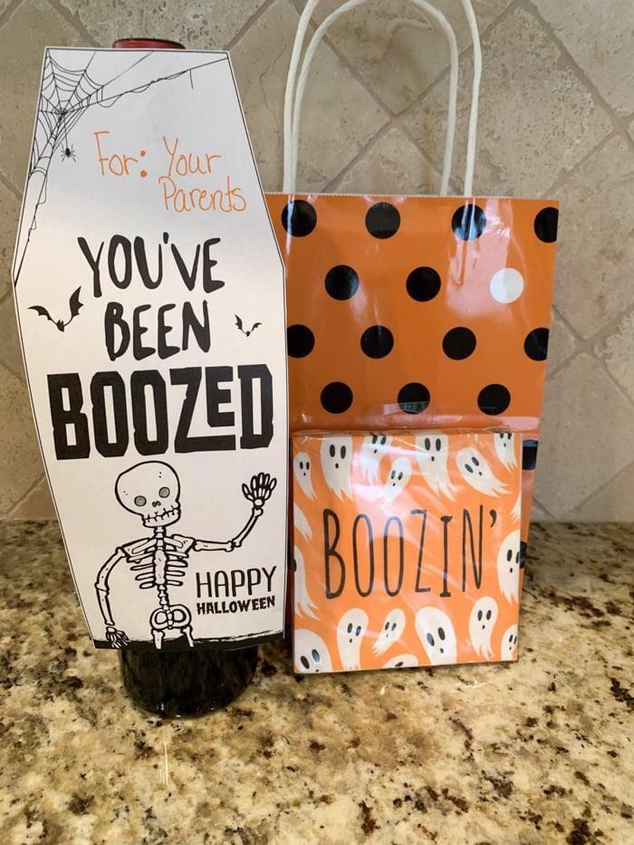 If you’re creating a Boo Basket for a wine enthusiast, there’s no need to stick to kid-friendly items. A bottle of wine or some beers tucked into a bottle bag makes for an ideal “Booze Basket.” After all, why should the kids have all the fun?