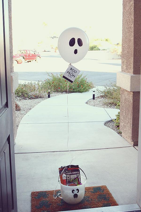 If you want to add a touch of drama to your Boo Basket, this ghostly version is a simple yet effective option. Just draw a ghost face on a white balloon and tie it to the handle of your basket. When your neighbor opens their door, they’ll be greeted by a ghost! It’s a fun way to make your Boo Basket even more memorable.