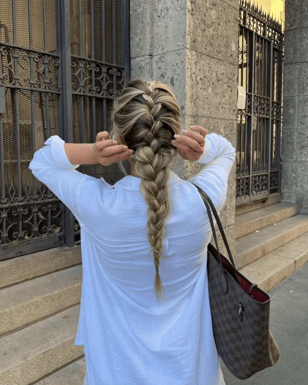 The Jumbo French braid is a French braiding hairstyle with large strands of hair. This hairstyle is typically braided from the base of the hair to the tips, creating a voluminous, thick, and prominent braid. To achieve this hairstyle, you will need a substantial amount of thick hair. You can create this braid on straight or curly hair. If you have straight hair, you can use a curling iron to add some waves before braiding. Afterward, use a wide-tooth comb to detangle the hair before braiding, as this will make the braiding process smoother. Use a small amount of gel or mousse to maintain the hair’s texture. If you have thin hair, you can consider using hair extensions to add thickness to your hair.