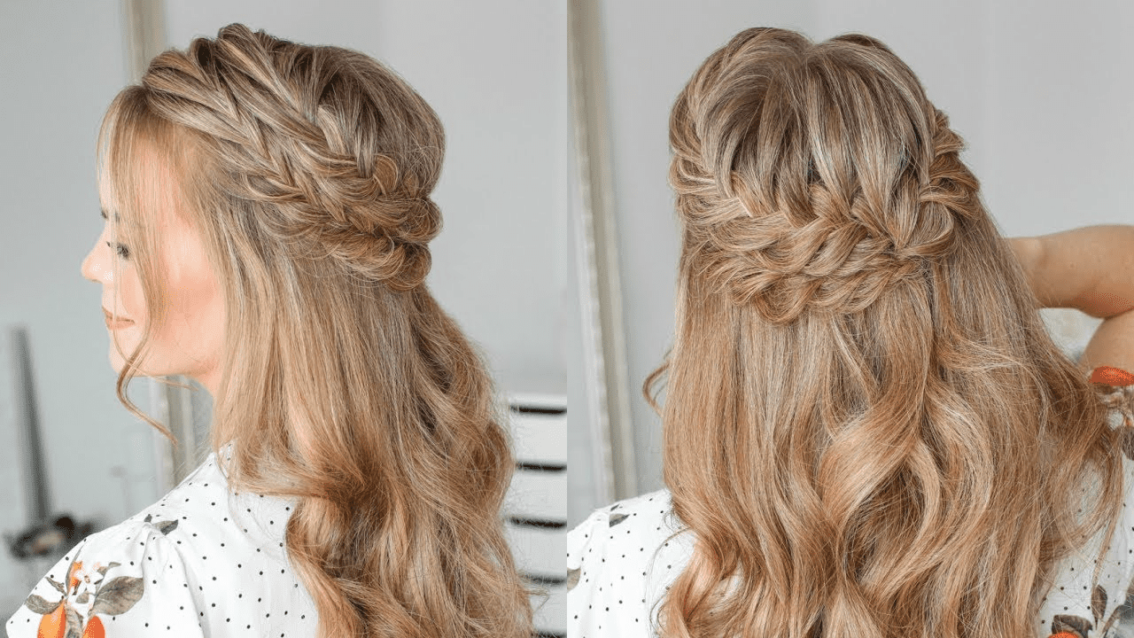 Embrace both the charm of braids and the trendy appeal of half up half down hairstyles by blending them into a delightful and stylish fusion. To achieve this look, begin by sectioning off a portion of hair at the top of your head. Commence French braiding from your forehead towards the back, transitioning into a regular plait as you reach the crown. Alternatively, you can secure the braid into a ponytail and wrap it around the base, using bobby pins to create an adorable topknot. This combination results in a fabulous and versatile hairstyle that’s bound to capture your admiration.