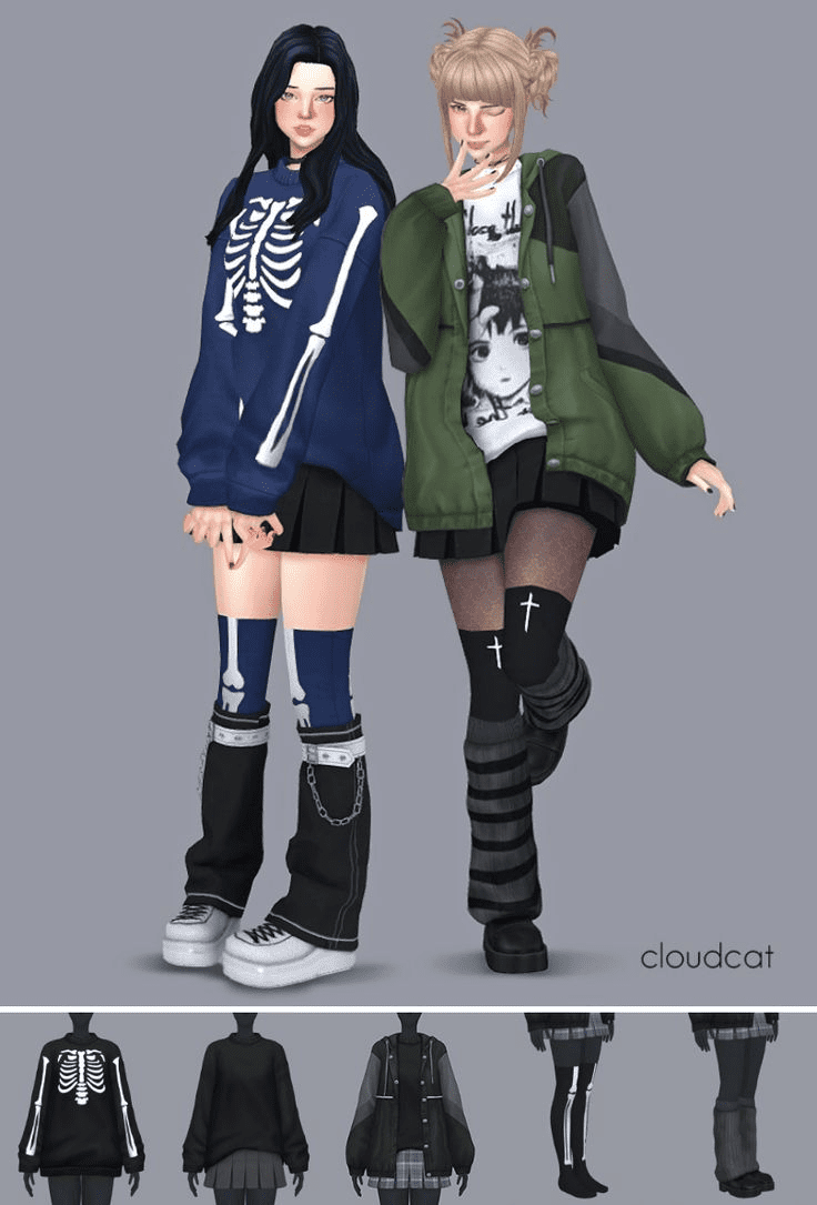 If you’re on the hunt for gothic-inspired CC for your Sims, the Blight pack from Cloudcat is a game-changer! This collection features an oversized shirt that’s a staple for any dark wardrobe, along with an edgy jacket outfit that screams attitude. The boots with legwarmers are an absolute must-have, and that skeleton pattern? Total goth goals. For anyone creating alternative or dark-themed Sims, this pack is an essential addition to your game.