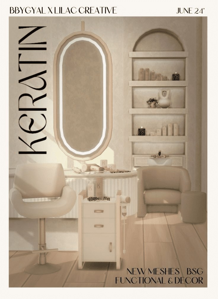 Transform your Sims’ space into a luxurious salon with the Keratin CC Pack by Lilaccreative and BBYGAL. This exquisite set includes elegant salon chairs, sleek storage solutions, and chic decor items, all designed to create a high-end beauty environment. Each piece radiates sophistication, making it an essential addition for any Sims’ home makeover. Pamper your Sims with this stylish collection and elevate their styling experience.