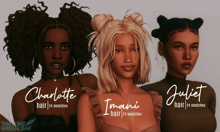 ThatoneGreenleaf is definitely one of my top creators, and their Sims 4 Female CC Hair Pack just reinforces why! This pack features three stunning hairstyles: curly pigtails with a playful, messy vibe, bun pigtails for a cute and casual look, and another unique style that’s simply irresistible. These versatile styles will elevate any outfit your Sims wear. I especially love the curly pigtails for adding a whimsical touch to my playful Sims’ looks.
