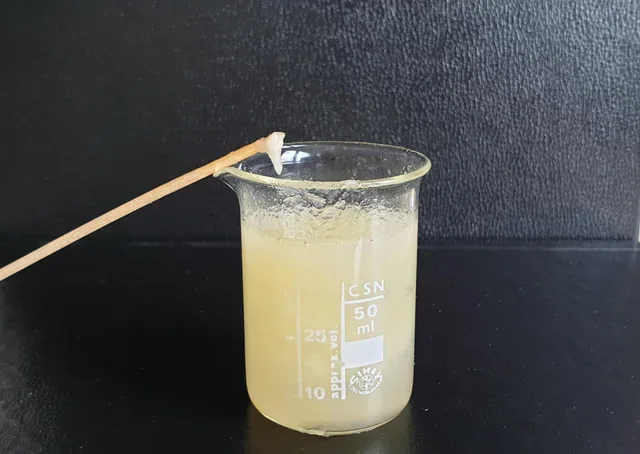 Isopropyl alcohol is crucial because DNA doesn’t mix with it. Instead, it forms a separate layer on top of the banana liquid. By adding the alcohol carefully, the DNA collects in this layer, and we can then use a skewer to pull it out and examine it.