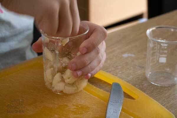 Step 2: Place the banana in a beaker or a small sealable plastic bag. Then, smash it into a mush! You can use a fork or stirring rod to mash it in the beaker, or use your hands on the outside of the plastic bag to crush the banana.