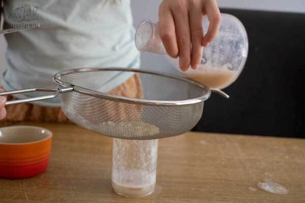 Step 5: Place a sieve over the glass or beaker you used for the water mixture. Pour the banana mixture into the sieve, letting the liquid pass through while catching any remaining clumps of banana. This will leave you with a filtered banana liquid.