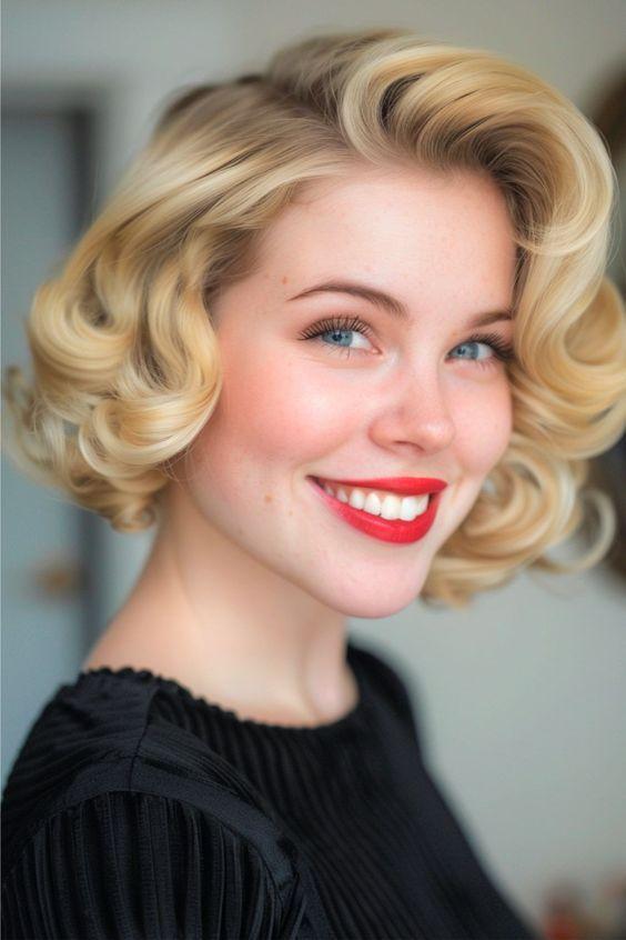 Here’s another retro look to consider! Tight curls paired with a hair clip create a romantic vibe. This hairstyle adds sophistication and timeless elegance to your ensemble. Channeling vintage glamour, these curls beautifully frame your face, highlighting your features with a nostalgic touch.