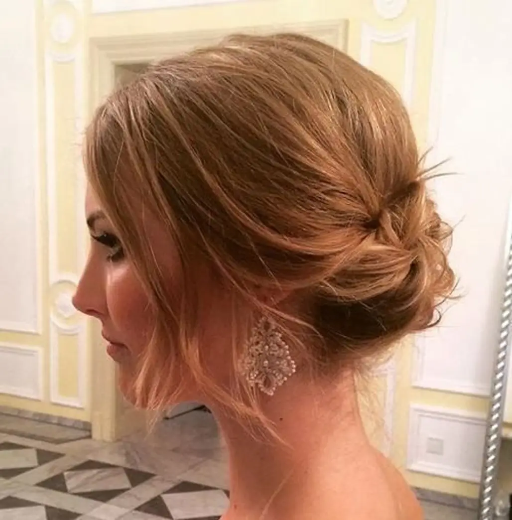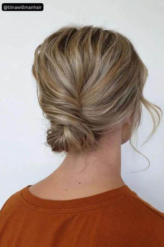This loose, low updo is a fantastic choice for girls with short hair seeking a sophisticated hairstyle for prom. To create this look, gather your hair at the nape of your neck and secure it with bobby pins. For added flair, leave out some wispy strands around your face to create a soft frame. This style is perfect for anyone wanting to look polished and stylish without spending too much time on hair styling.
