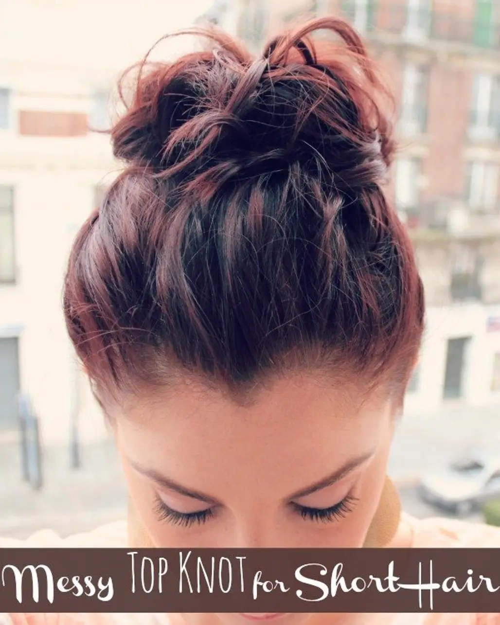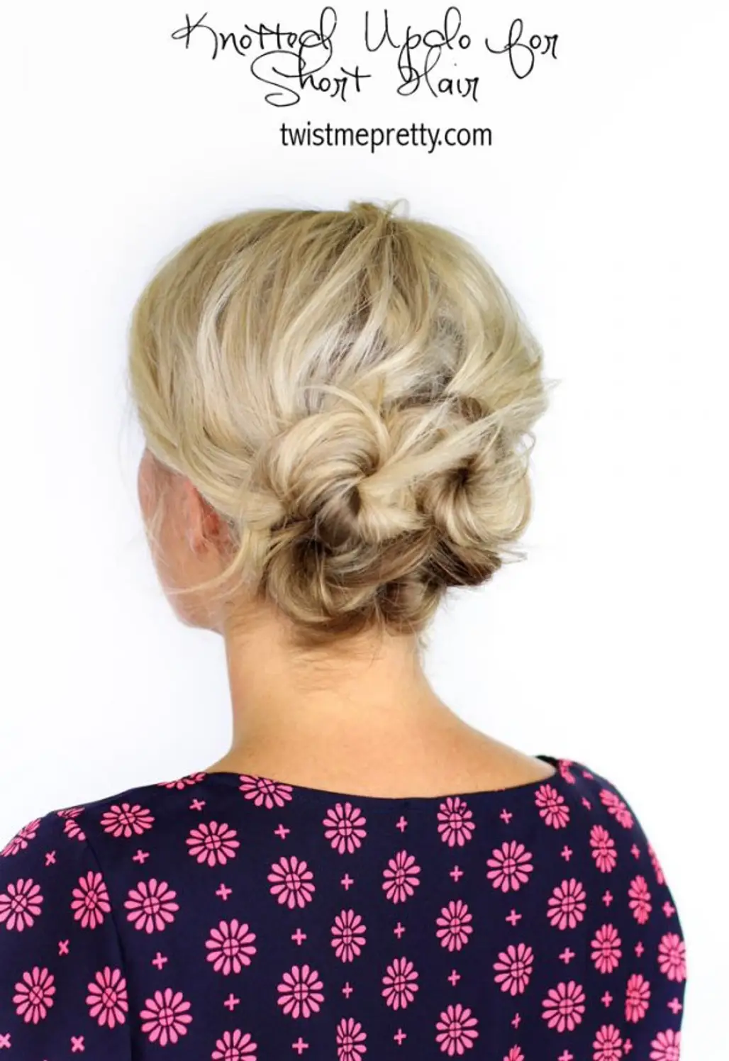 To achieve this chic and playful knotted updo, start by dividing your hair into two equal sections. Create two ponytails, one above the other, and secure them with hair ties. Twist each ponytail into a small knot and pin it in place, ensuring the ends are tucked in neatly for a polished finish. This hairstyle is great for various occasions, from casual get-togethers to more formal events, making it a versatile and stylish choice for those with shorter hair. Follow the linked tutorial for a detailed step-by-step guide to ensure a flawless result every time.