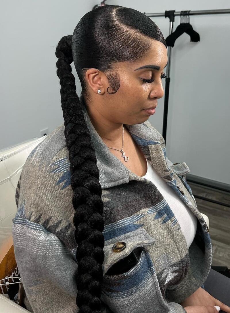 If you’re looking for a simple yet stylish braided ponytail, try the side part feed-in ponytail. This trendy protective style is stunning and turns a basic braided ponytail into an elegant, sleek look that’s perfect for any event.