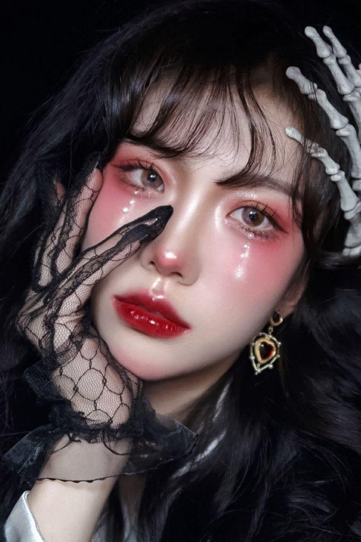 This might just be my favorite makeup look in today’s compilation! I love how the highlighter on the cheekbones, lips, and white “tears” create striking accents. A hint of pink blush on the nose and chin adds a youthful touch to this Gothic Lolita aesthetic.