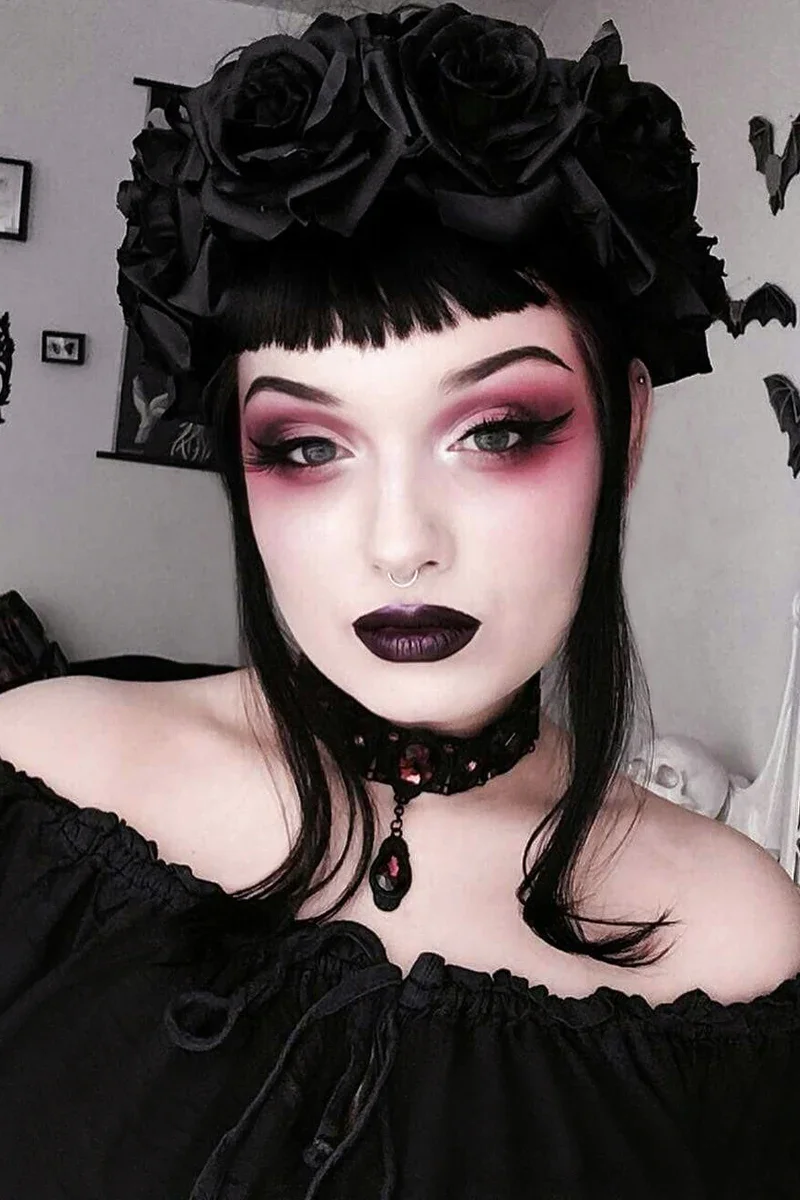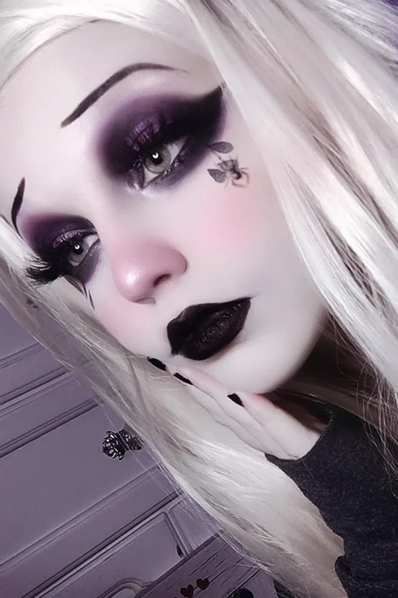 You can never have too much drama with Gothic makeup! This next look has it all: stunning purple and black smoky eyes? Absolutely! Sleek, thin black eyebrows? You bet! Bold black matte lips? Definitely! And to amp up the contrast, a luxurious platinum blonde wig will take the drama to the next level.