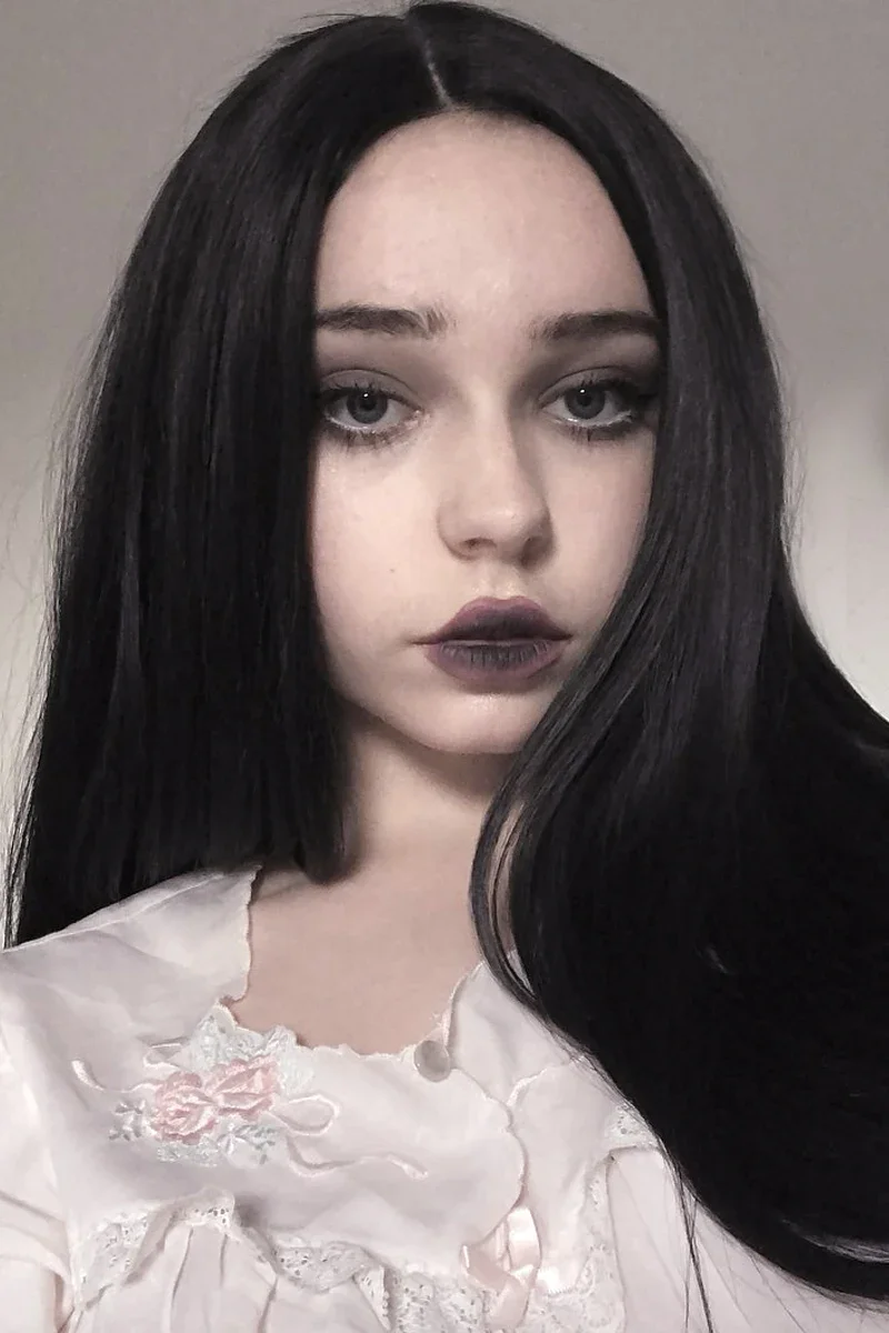 Absolutely! The Gothic Lolita style beautifully balances cute and edgy, and it doesn’t always have to be dramatic. This cute GothLoli look, featuring soft peach blush and glossy lips, captures that perfect blend. The subtle lash look adds a touch of purity, making it perfect for daytime wear. Would you consider rocking it at school?