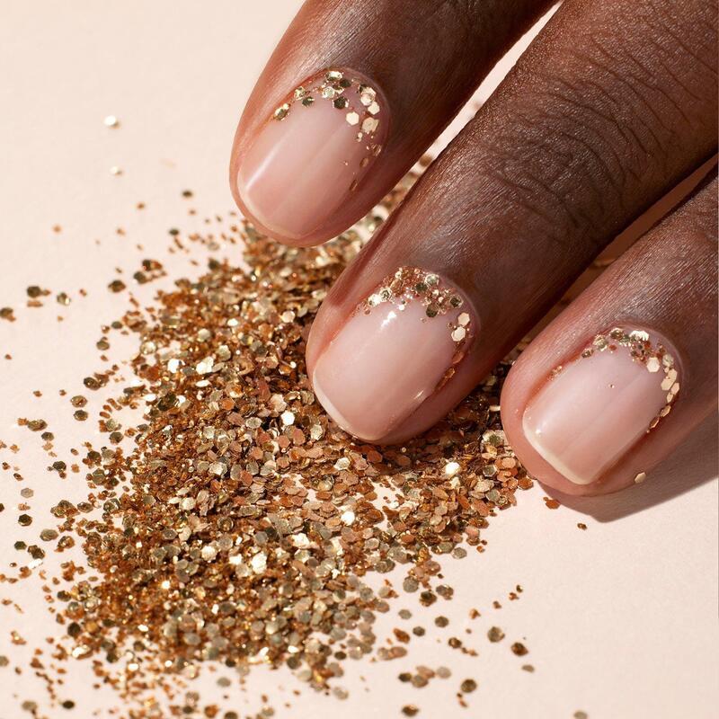 Nude base with glitter accent at cuticle. Subtle sparkle creates a refined contrast for an elegant look.