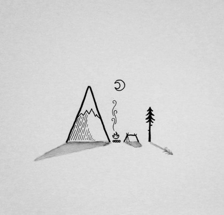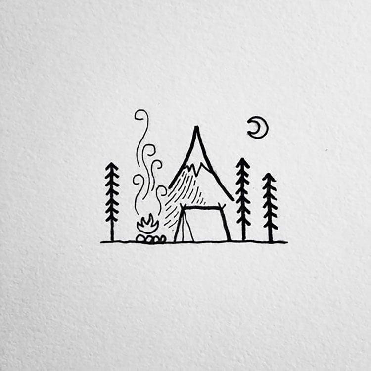 This minimalist camping area sketch is ideal for beginners. It’s easy to draw and makes a lovely addition to a handmade greeting card or a thoughtful gift.