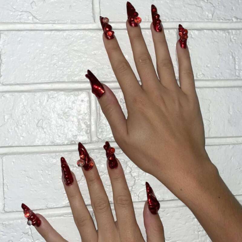 The fire emoji perfectly captures these chrome French tips. By transforming the classic design into silver flames, you’ll be all set for a hot girl summer.