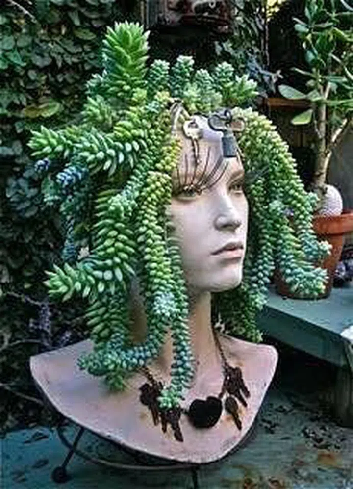 Crafted with just one type of succulent, this striking display features a mannequin adorned with a head full of Donkey Tail succulents, guaranteed to delight your visitors. The succulent’s cascading tendrils form a lush, flowing mane, lending an almost ethereal quality to the figure. This fusion of the human form and nature’s bounty creates an element of surprise and wonder, making it a captivating conversation piece and a testament to the limitless creativity possible in the realm of terrarium crafting.