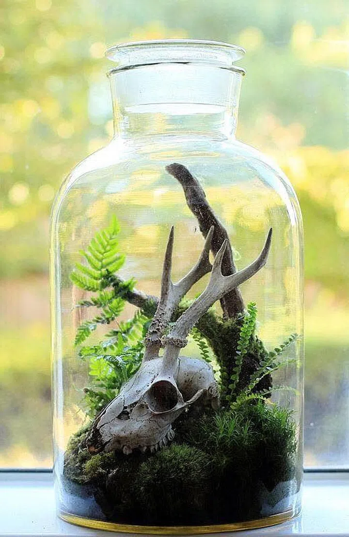 For a gothic and mysterious aesthetic, consider incorporating an artificial animal or human skull model into your terrarium design. Pair it with long twigs and ferns to create an unconventional setup that embraces the darker side of aesthetics. This unique terrarium transforms into a visual narrative that sparks the imagination. The Moss and Fern Terrarium becomes a captivating tableau, where the combination of natural elements and macabre accents invites viewers to explore the intriguing intersection of beauty and mystery.