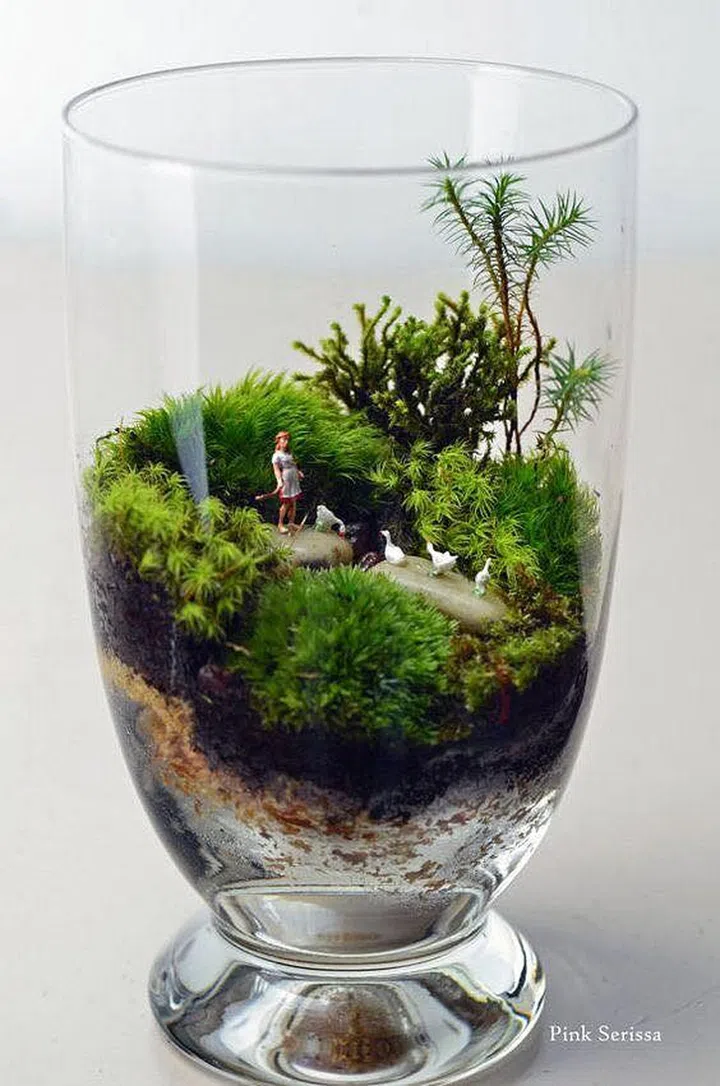 It’s all about proportions in a terrarium! If you can find small figurines, like these ducks and a girl, your regular mosses can create the illusion of a beachside scene. This careful attention to proportions, combined with the imaginative use of figurines, transforms the moss and fern terrarium into a dynamic visual story. It beautifully blends the enchantment of nature with creativity, transporting viewers to a whimsical miniature world full of wonder.