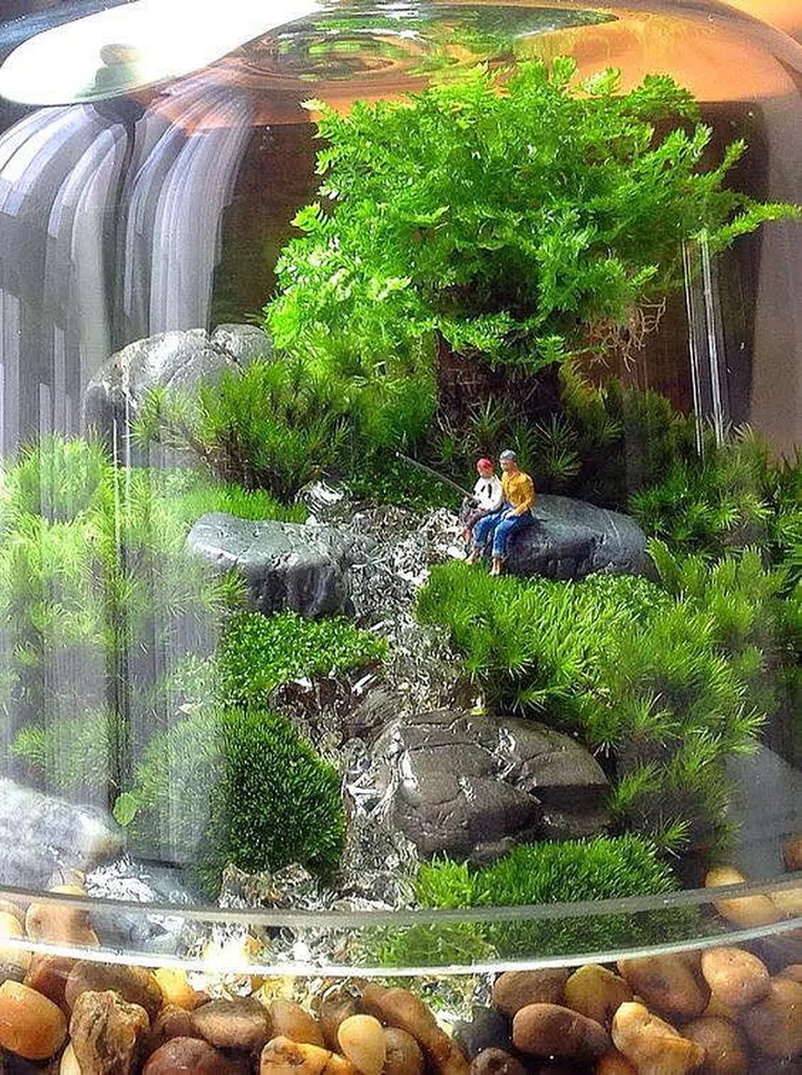 How about envisioning a scene of a couple fishing along a bubbling brook? You can use clear gel potting soil or small transparent acrylic rocks arranged closely together to create the illusion of flowing water cascading over a series of rocks. This clever technique not only adds a lifelike quality to the miniature waterfall but also serves as a visually striking focal point.