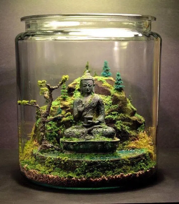 If you’re not fond of regularly watering your miniature landscape, consider using dried lichen, available at Art Friend or any modeling shop, to mimic the appearance of small trees and bushes. This artificial terrarium can be stunning, featuring a giant Buddha surrounded by these delicate, tree-like structures atop a mountain landscape. The combination of elements creates a breathtaking scene that captures the essence of tranquility without the maintenance of live plants.