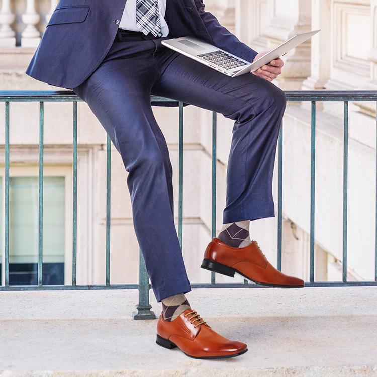 Brown Penny Loafers, as semi-formal slip-on shoes, strike an ideal balance between comfort and style. Their exceptional versatility allows them to seamlessly pair with various outfits, including suits. Lighter shades such as tan or brown particularly enhance the overall appeal when paired with navy suits, surpassing the impact of darker options like black. The aesthetic qualities of these preferred shoe colors for navy suits contribute to a more graceful and refined formal attire. Elevate the ensemble by incorporating a white or light pink dress shirt, and enhance the look with a pocket square and stylish dotted socks for a touch of flair.