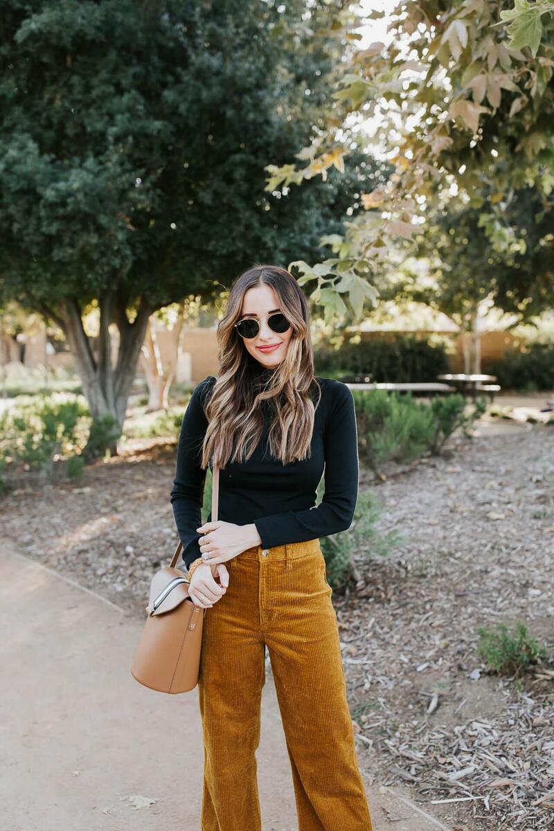 For a cozy and stylish fall ensemble, opt for a black turtleneck sweater paired with high-waisted brown corduroy pants. Tucking the sweater into the pants creates a sleek and tailored silhouette, while the combination of black and brown offers a classic yet contemporary color contrast. Complete the look with black chunky boots for a touch of edge and practicality, perfect for navigating through autumnal weather with style and comfort. This outfit effortlessly blends comfort and fashion, making it a go-to choice for crisp fall days.