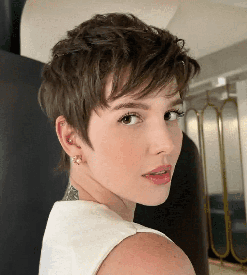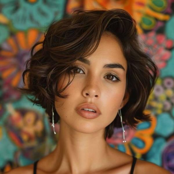 A brunette pixie bob with layers is a stunning medium-to-short haircut that beautifully frames and accentuates the face. Layering a pixie bob adds body and movement, making the haircut easier to style. While a pixie bob does require daily styling to maintain its intentional look, the process is typically quick and straightforward.