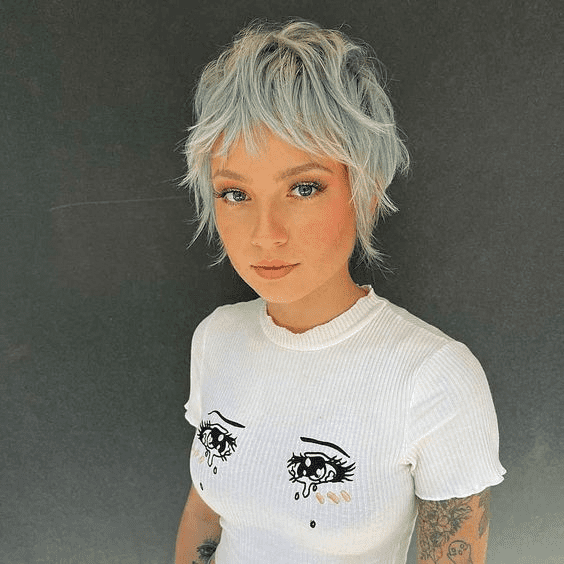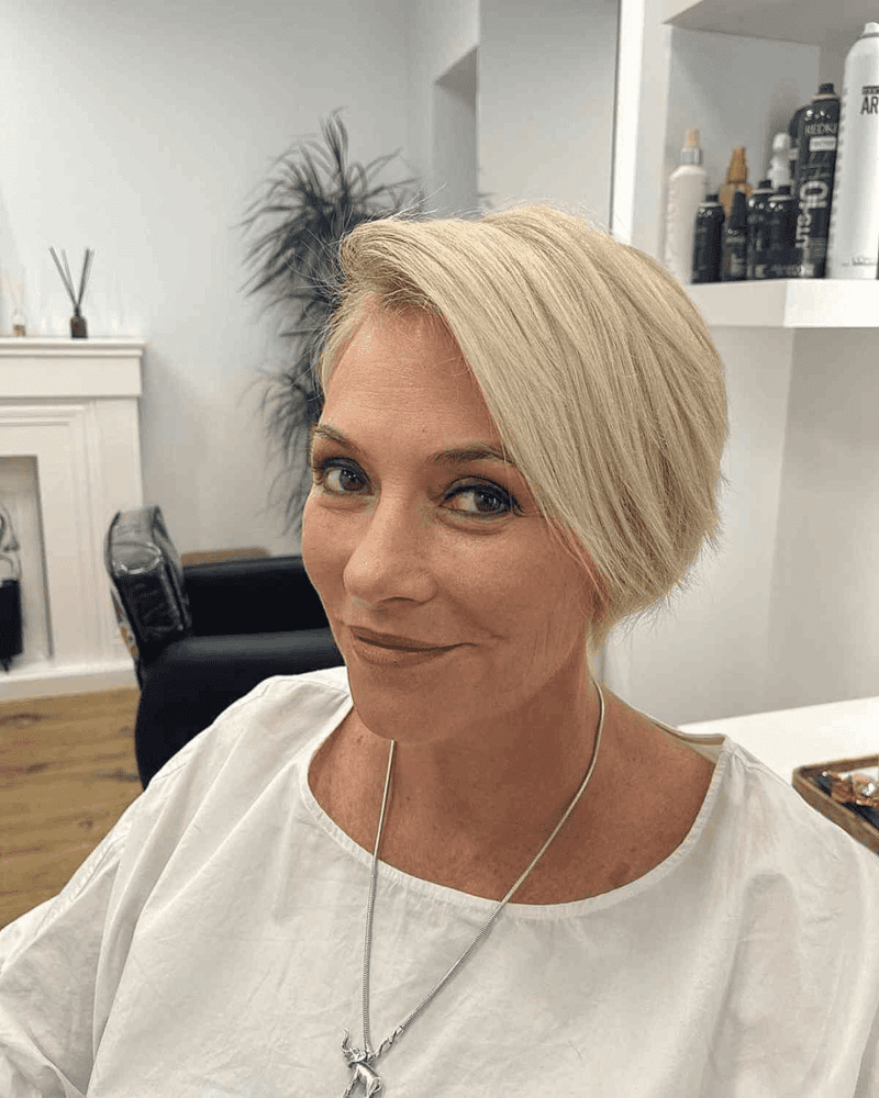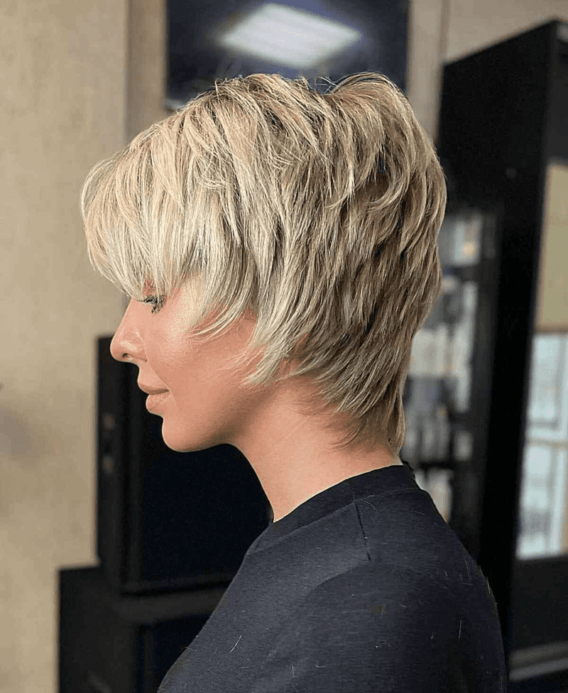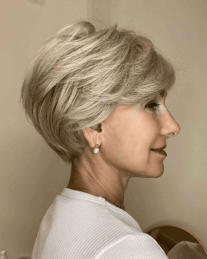 Opt for a side-swept long pixie cut with layers for a look that’s both edgy and chic. This versatile haircut suits women of all ages and adds a touch of sophistication. Enhance your layered pixie with a stunning shade of champagne blonde.