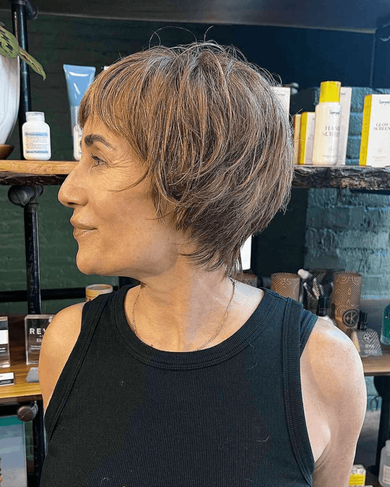 For older women with thick brown hair, incorporating visible layers into a lixie cut can create a youthful appearance. Ask your stylist to add layers that reduce weight, making the hair more manageable while adding volume. It’s important to balance the layers and length to prevent the hair from looking too thin or short. To style, use a blow-dryer and a large round brush to achieve volume and shape. For extra body and texture, consider using mousse or a volumizing spray.