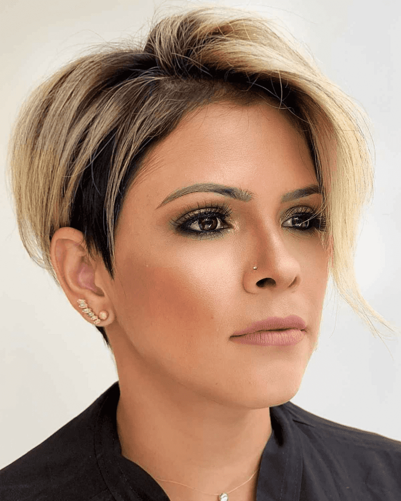 Being in between styles can look fantastic, especially with a versatile lixie. A long pixie cut works wonderfully for showcasing blonde highlights with darker roots, offering a stylish and adaptable short hairstyle.