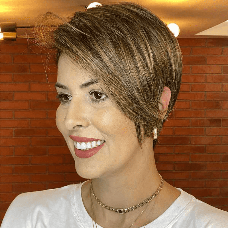 Opt for a charming light brown pixie with textured layers. To achieve this look, request a long, swooped bang and uniform layers. For added dimension, consider highlights with lowlights to accentuate the layers. This style is ideal for women seeking a trendy, low-maintenance haircut.