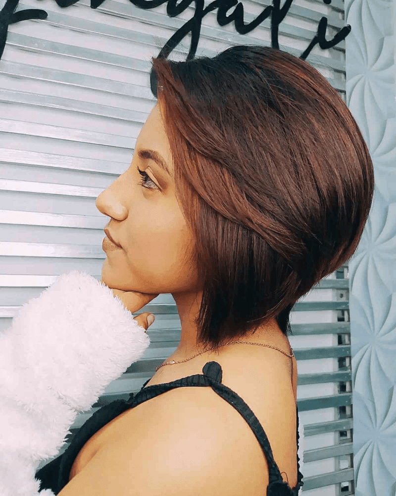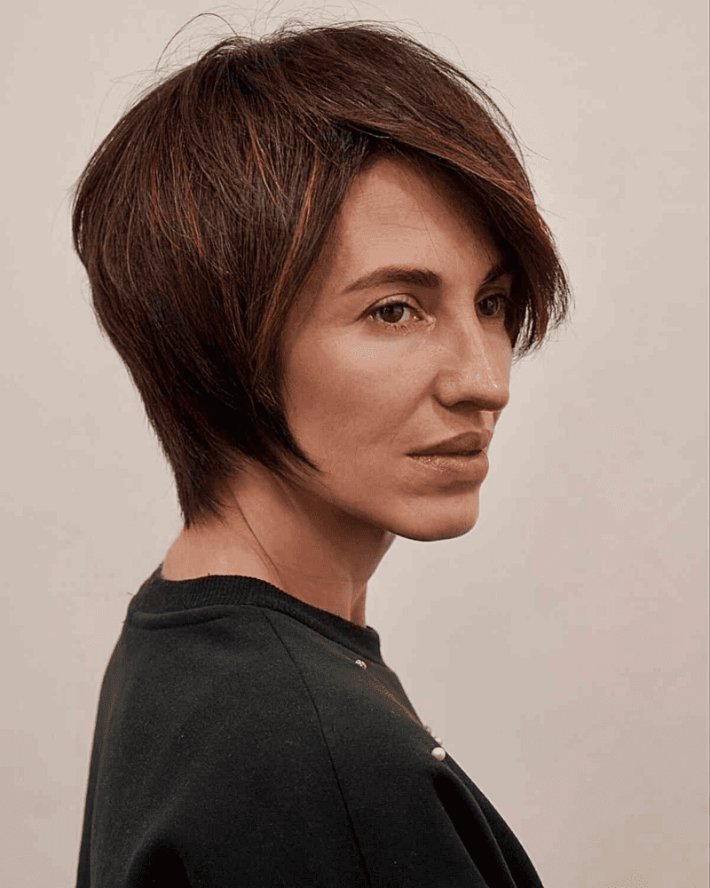 A brunette pixie bob with layers is a stunning medium-to-short haircut that highlights and frames the face. Layering adds body and movement, making the style easier to manage. While a pixie bob does need daily styling to maintain its polished look, the process is usually quick and simple.