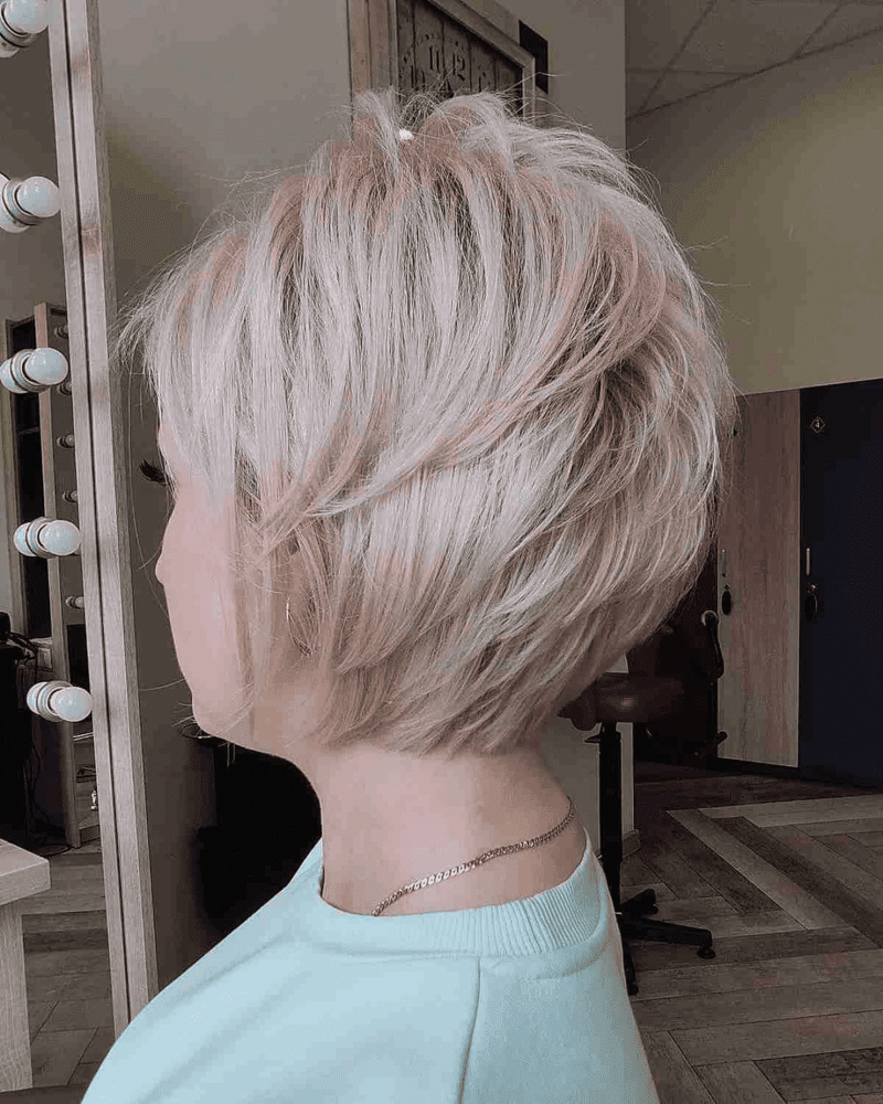 Choose a long layered pixie hairstyle for thin hair to add movement and create a fuller look. This style typically falls at or below the ears, with a fringe that grazes the jawline. Consult your stylist to see if a platinum blonde shade would suit your skin tone.