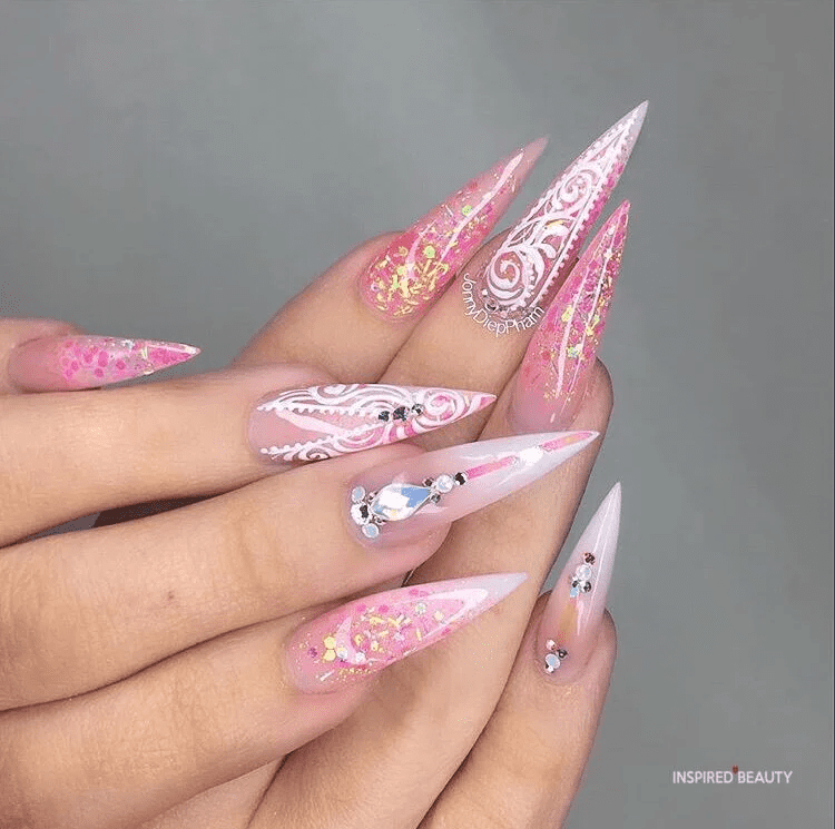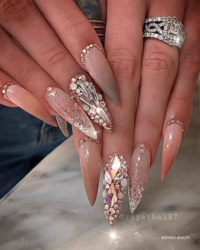 The intricate detailing and sparkling gems in this design offer a luxurious and festive look, making sure your nails shine brilliantly as you welcome the New Year. The sheer pink base beautifully complements the pink tones in the gems, adding a touch of elegance and cohesion to the design.