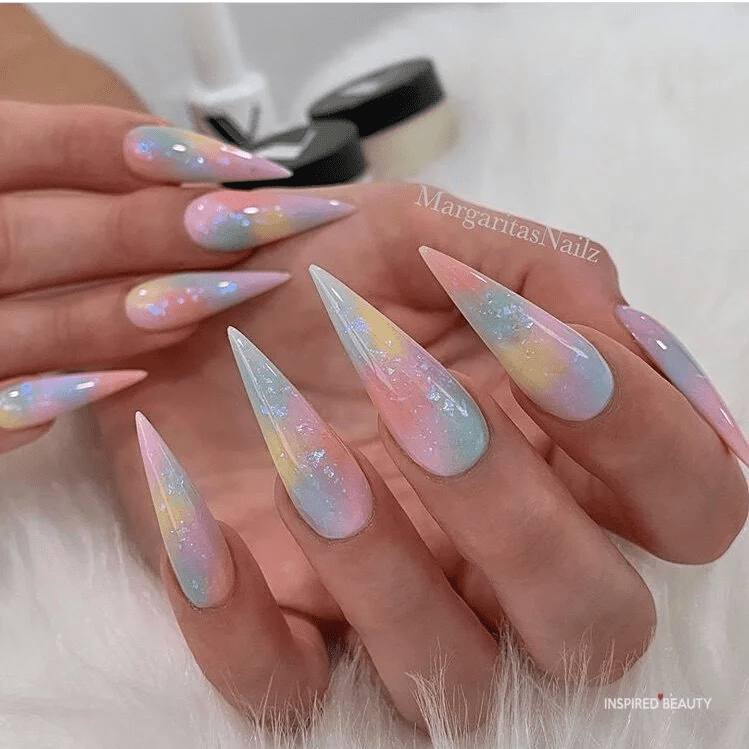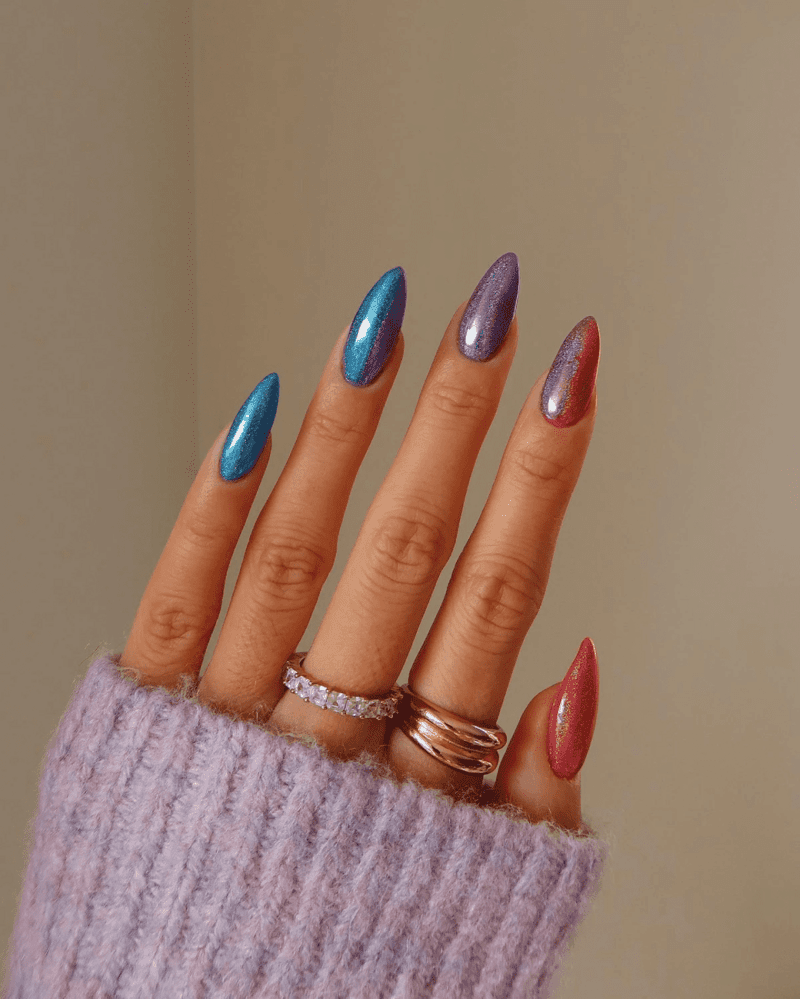 When in doubt, simply dip your nails in glitter and call it a day. The multicolor shimmer in these nails is truly mesmerizing, catching the light with every movement and creating a dazzling effect. This approach ensures your manicure stands out with a vibrant, festive touch, making it perfect for any celebration.