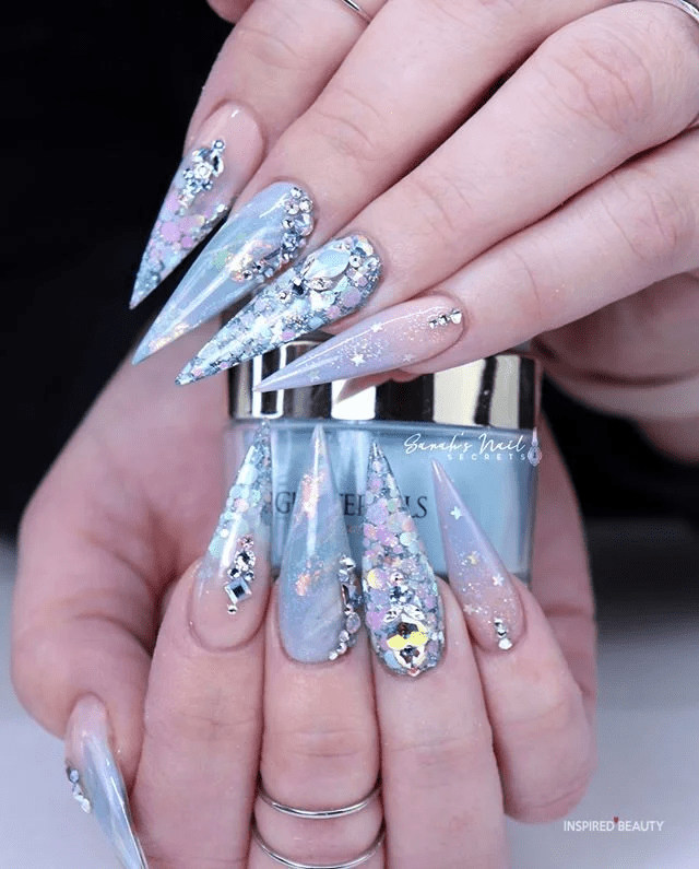 Illuminate your New Year’s Eve with a dazzling glitter manicure, complete with intricate nail art and stylish baby blue accents. This combination beautifully captures the festive spirit while ensuring your nails are the perfect accessory for the celebration.