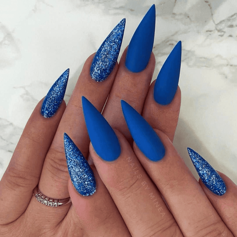 Enhance a vibrant color like cobalt blue with alternating half-glitter designs for a striking New Year’s look. Pair it with corresponding gold jewelry to really turn up the volume and make your nails the star of the celebration.
