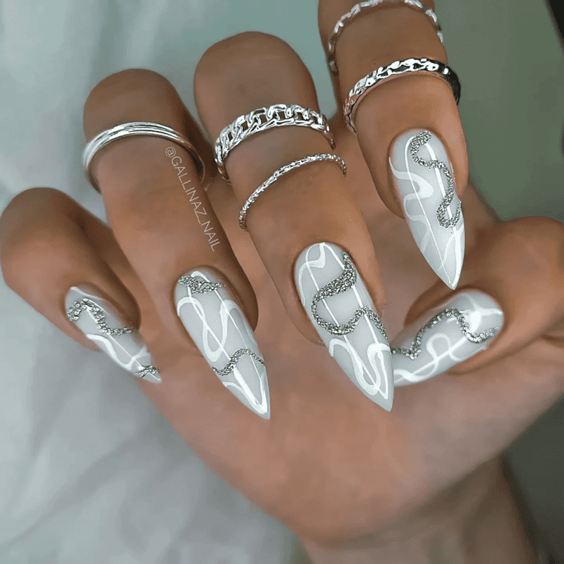 For a minimalist New Year’s look, consider going with a clean, color-free manicure accented by a hint of silver adhesives. The abstract design is subtle yet undeniably stunning, making it a sophisticated choice for celebrating the occasion.