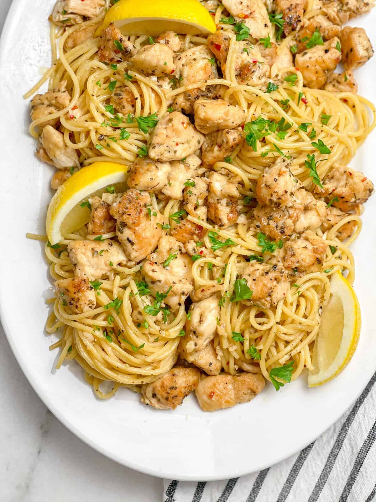 • Combine: Toss pasta into the sauce and chicken. Garnish with parmesan and lemon wedges.