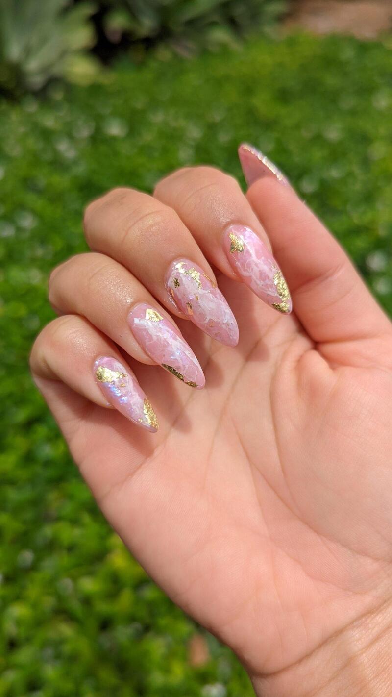 The shape, colors, and glossy gel finish all combine to create a stunningly subtle look, resulting in natural-looking yet impeccably polished nails.