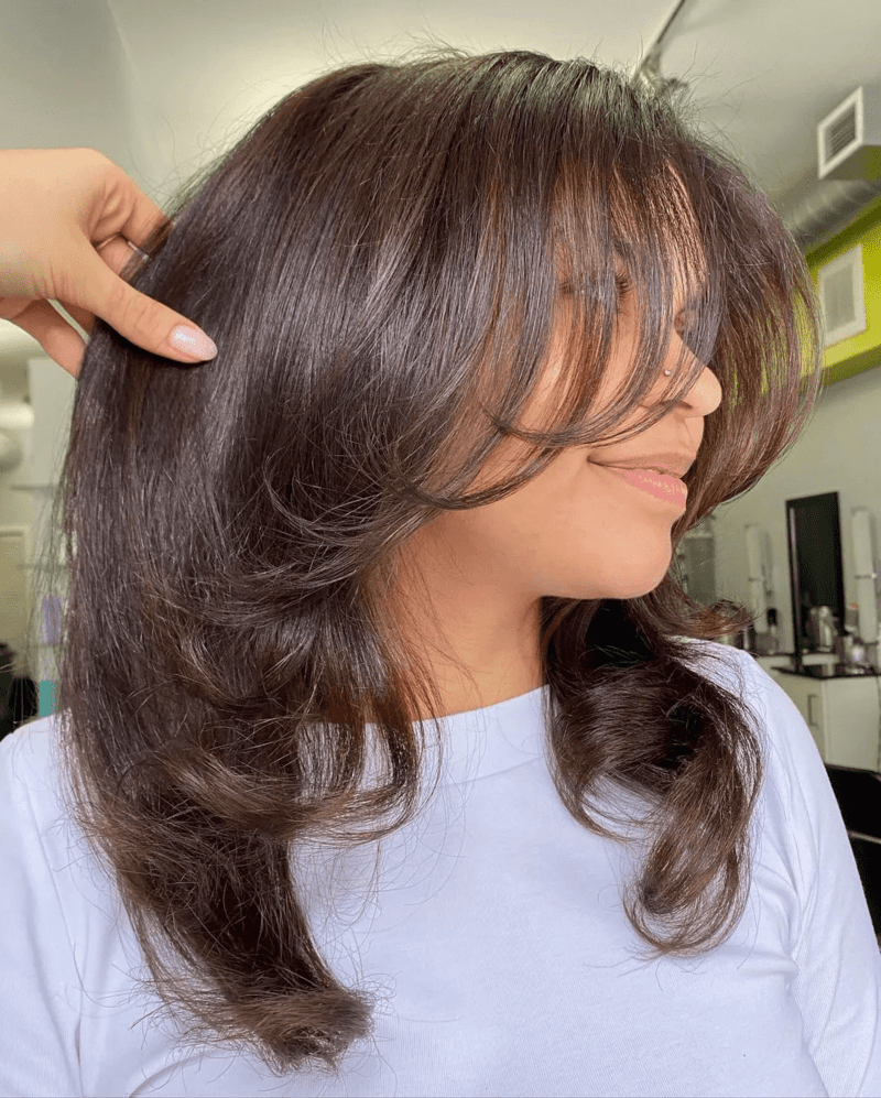 Sleek medium-length haircuts with long layers complement a wispy fringe, resulting in a romantic look. Plus, long layers offer versatility, giving you a broader range of styling options.