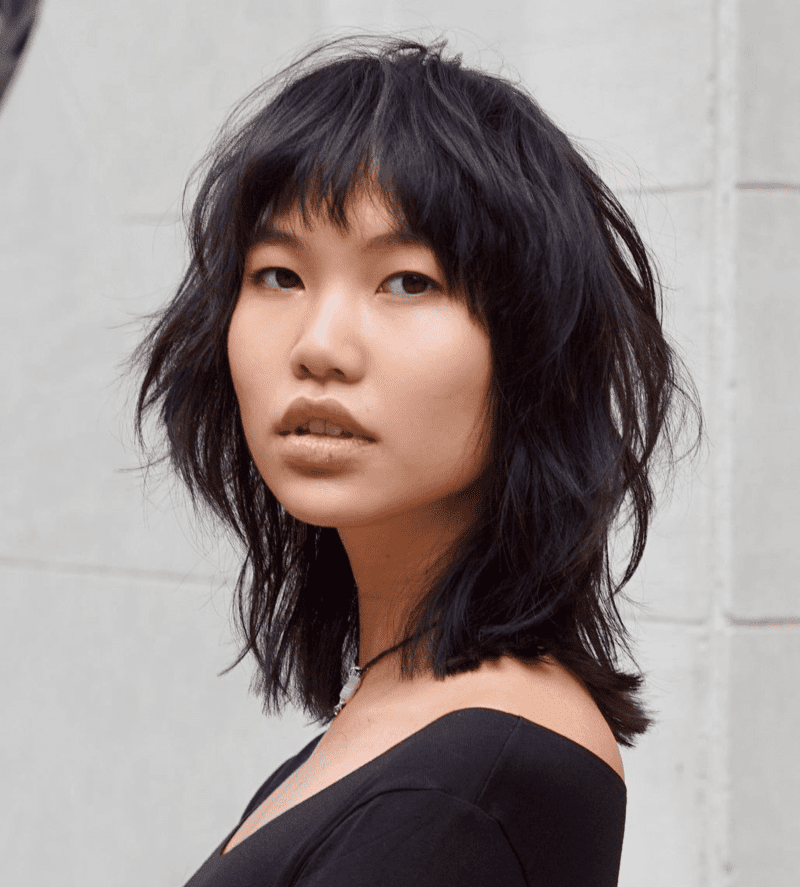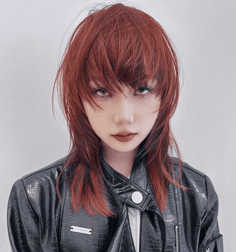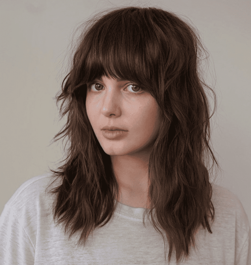 This shaggy cut is defined by its edgy appeal, featuring heavy layering, thick, messy bangs, and a vibrant color. It’s the perfect choice if you want to make a bold statement and stand out from the crowd.