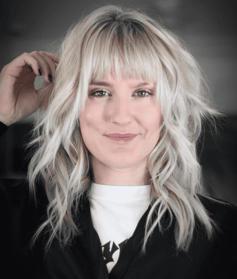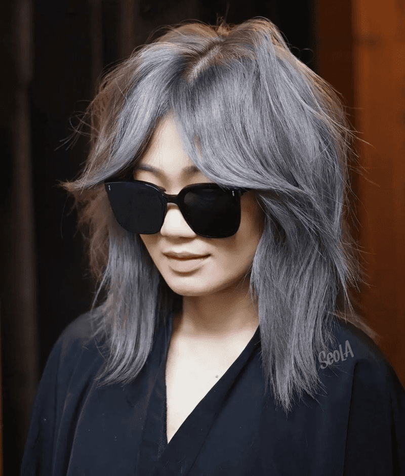 Here’s another great example of edgy and sassy medium-length hairstyles. A textured lob with subtle layers in a dark gray shade looks fantastic, and the trendy bottleneck bangs – a shorter take on the popular curtain bangs – perfectly finish off this look.