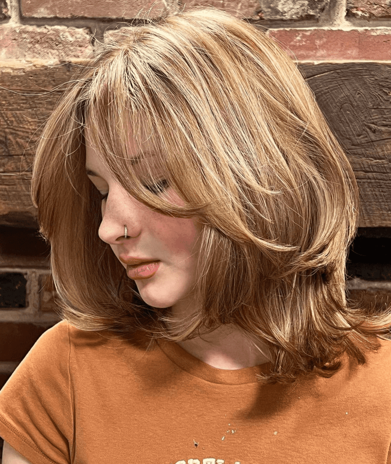 STRAWBERRY BLONDE MID-LENGTH HAIR WITH FEATHERED LAYERS